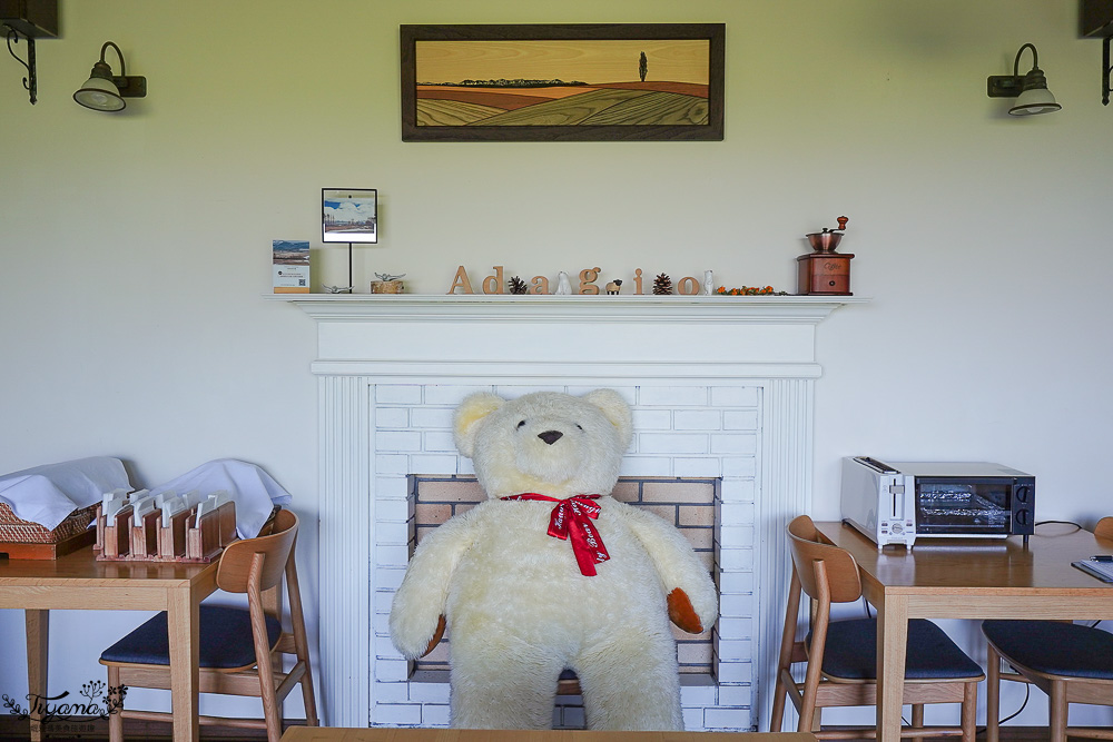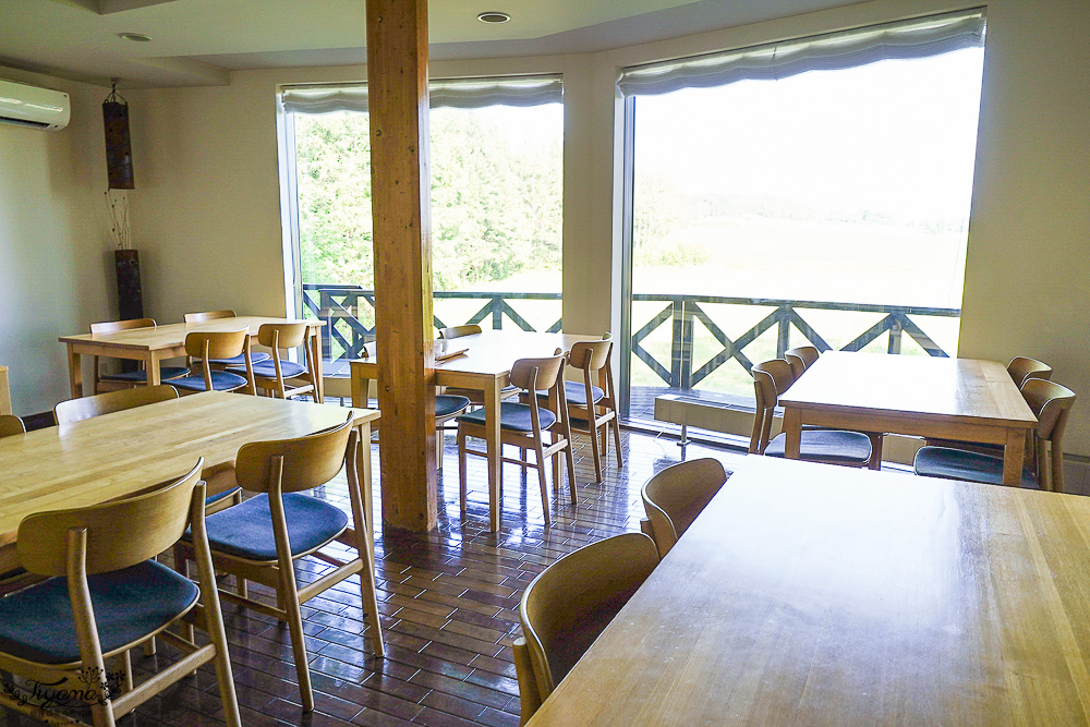 簡約風格的餐廳,最棒的是大面玻璃窗前的美瑛農田美景,綠地配藍天就是美瑛最經典的風景。