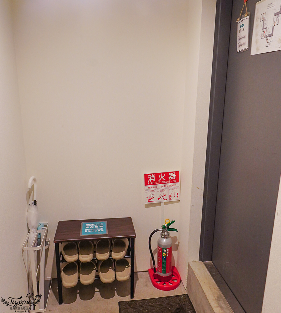 入口是玄關換鞋區,拖鞋只能在室內使用,不能穿到戶外,雨傘、消火器也在旁邊。