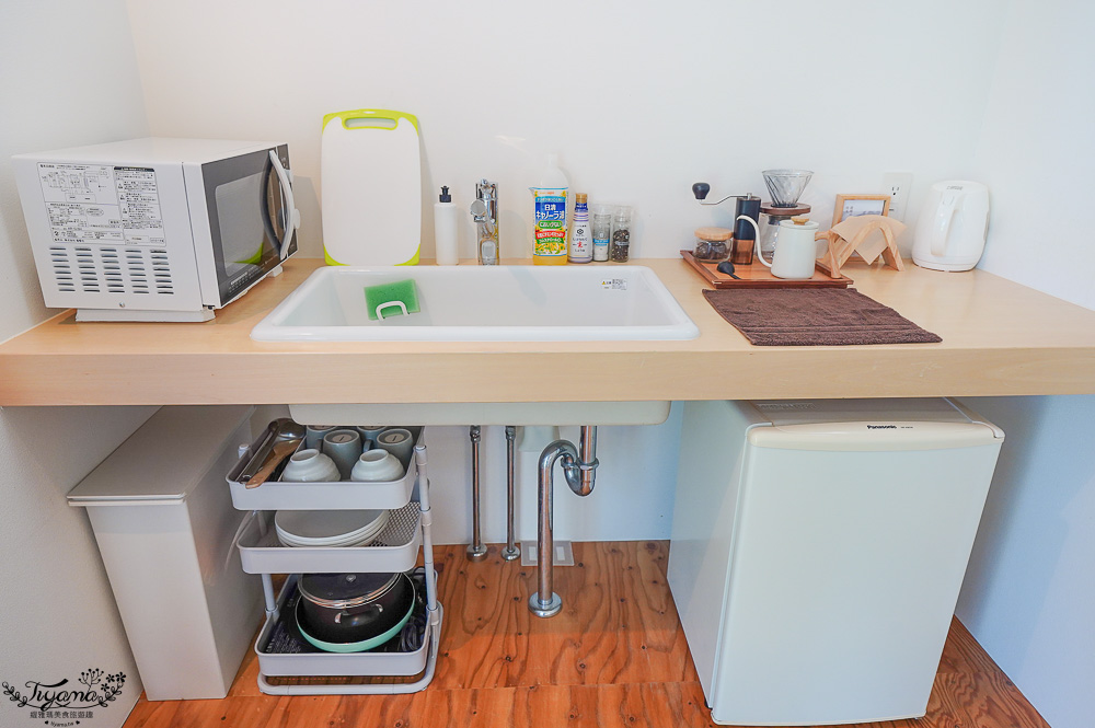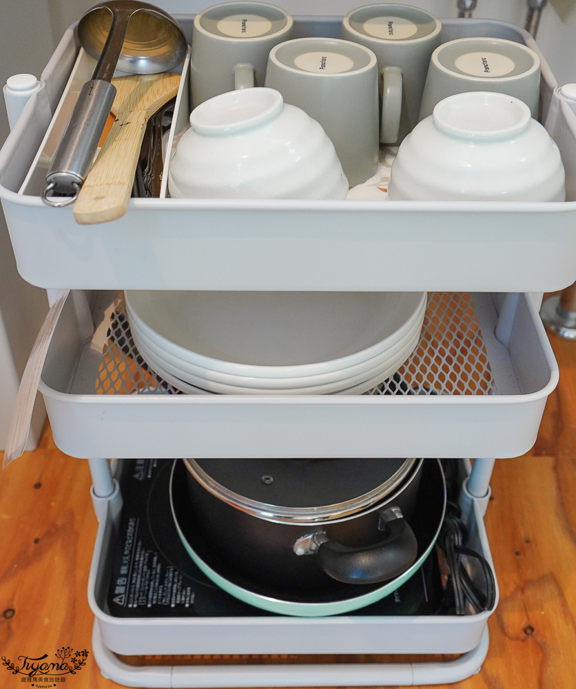 在2樓半設計一處簡易廚房,有微波爐、IH爐、冰箱、快煮壺、鍋具、餐具,就連細節的沙拉油、調味料都準備好,入住時管家有特別提醒,如果有炊煮務必要把分類作好,使用的鍋具餐盤也需要清洗好。