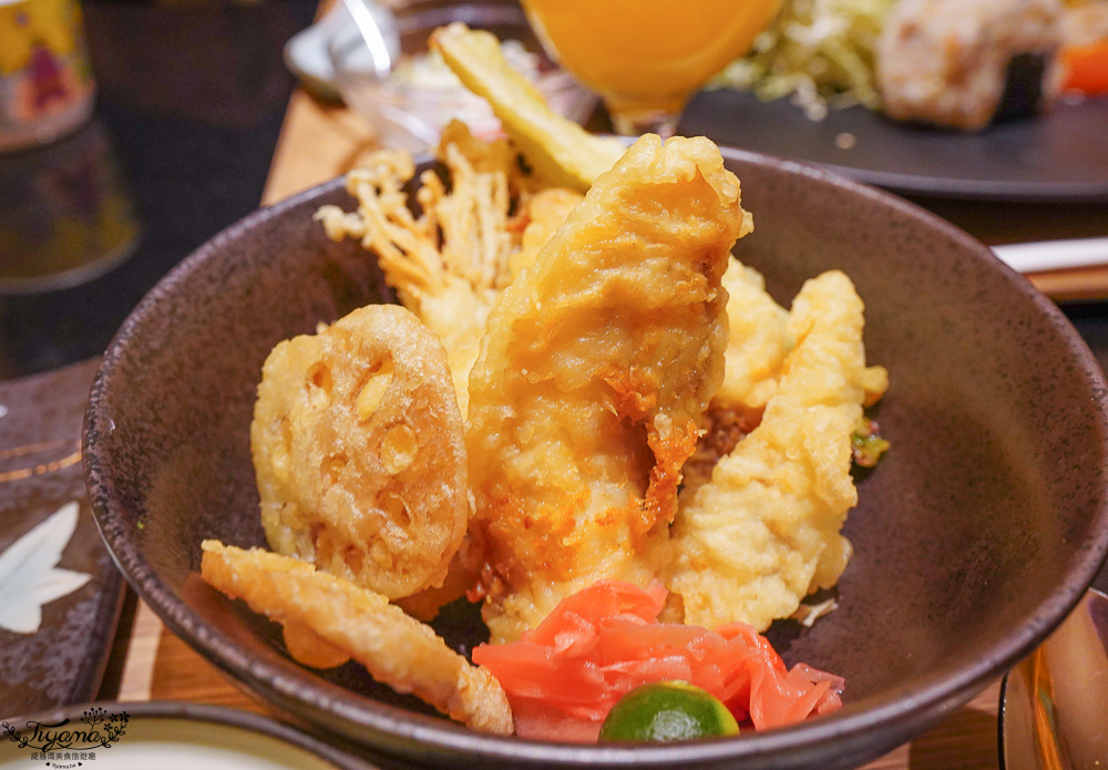 紅鮋魚天揚選用阿拉斯加深海紅鮋魚,炸至外脆裡嫩,足足有3片炸紅鮋魚片再搭配野菜天揚,把蘿蔔泥放進沾醬就是傳統日式蘿蔔泥沾醬,沾上後清脆不油膩,完全滿足口慾。