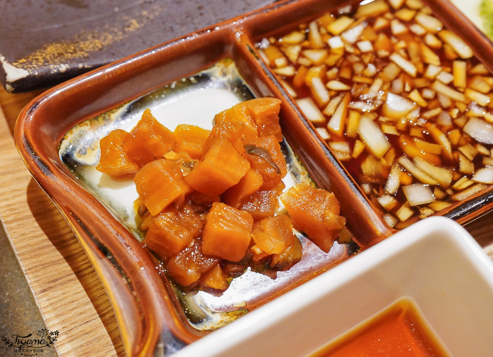 先付二品選用新竹在地名店勝華香食品行的東坡煙腸 ,就是新埔市場飄香一甲子的客家水煙腸,以黑豬瘦肉混合中藥香料醃製,再與地瓜粉漿手工灌入腸衣,沾上佐醬非常開胃。