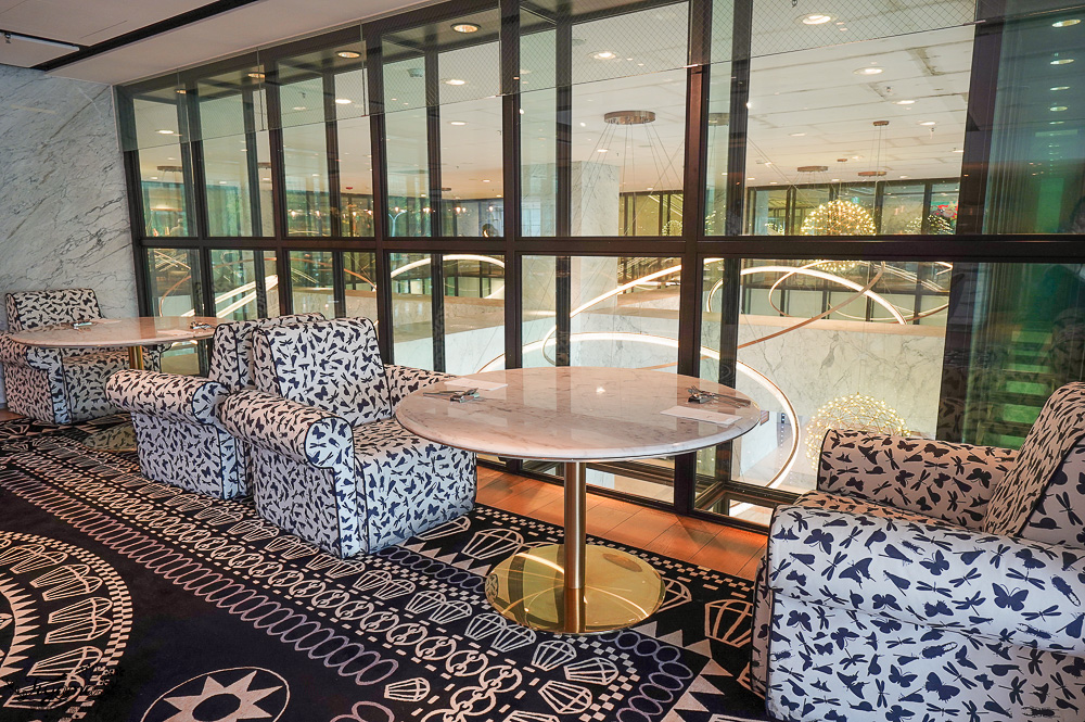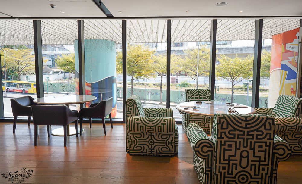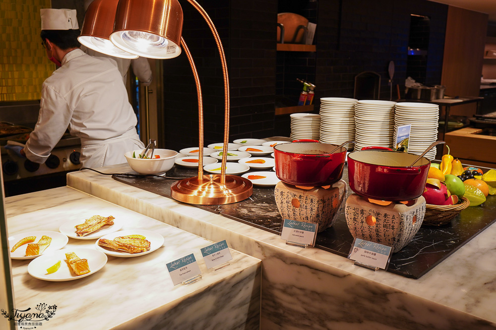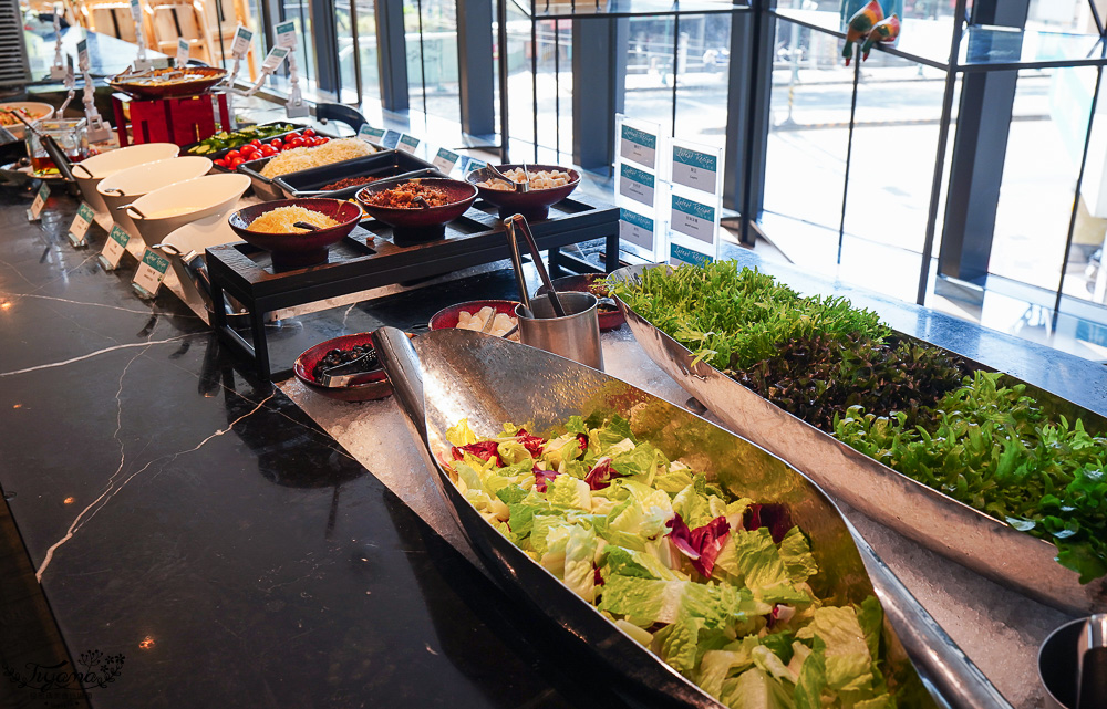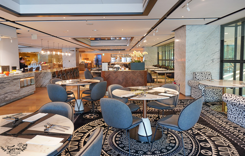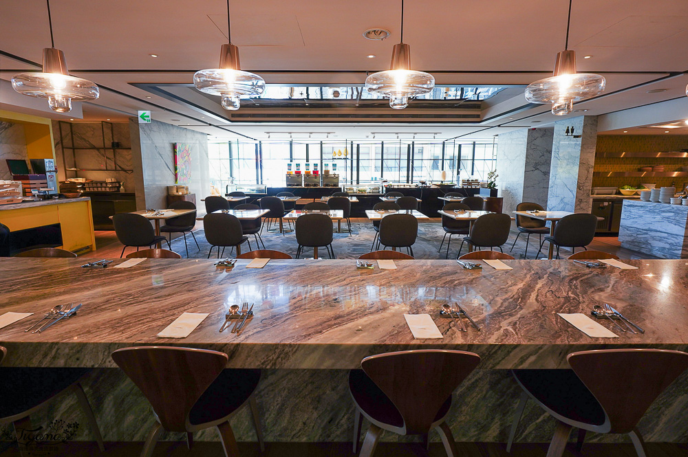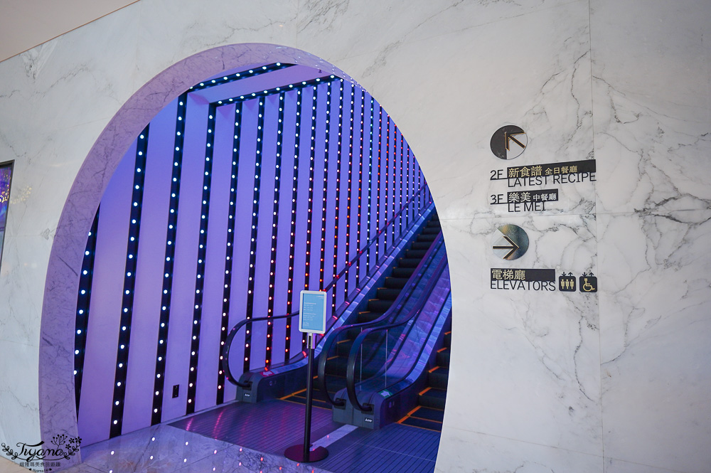 走進台中李方艾美酒店,從大廳櫃台旁炫麗的手扶梯直達2樓就是新食譜全日餐廳入口,也可再往內走搭電梯上去。