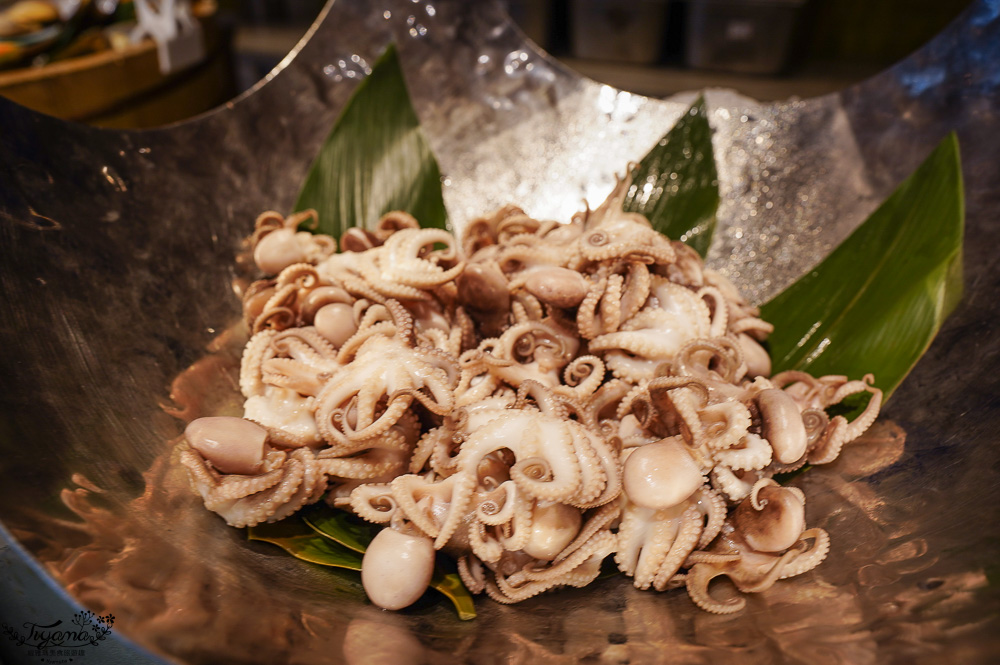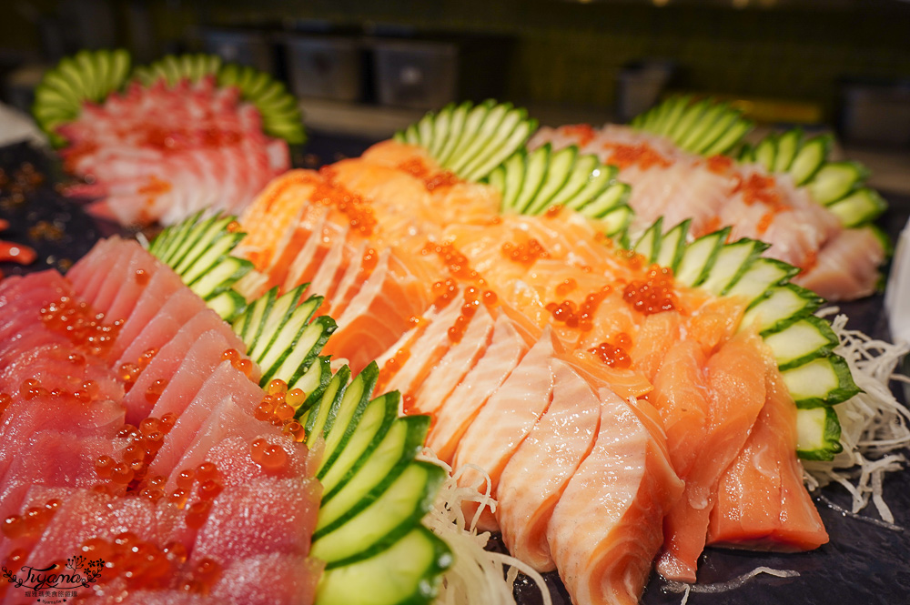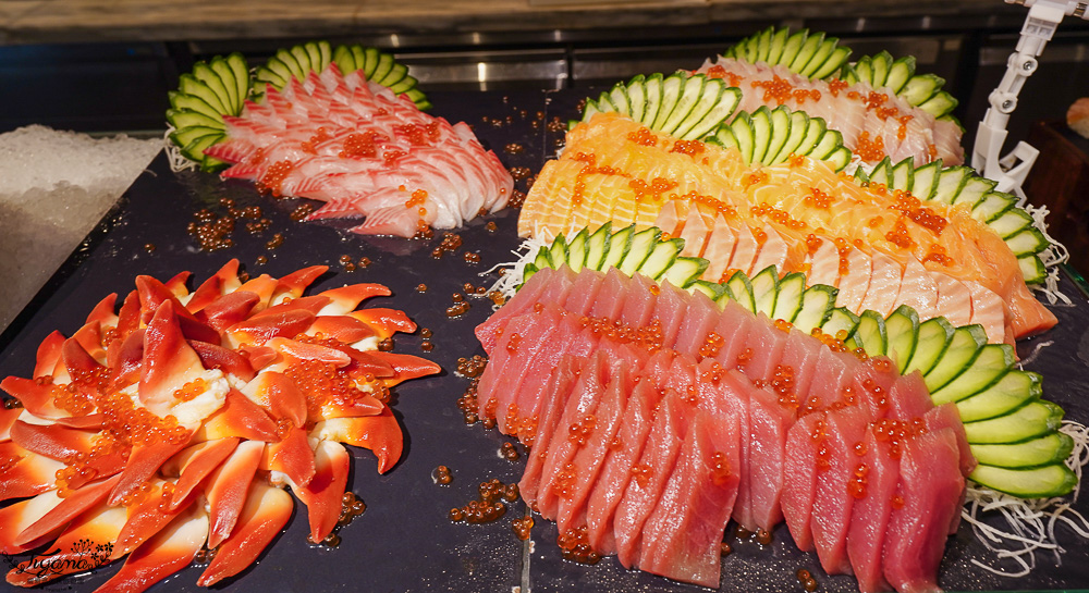 生魚片區有:小章魚、北寄貝、鮭魚、鯖魚、鯛魚…等,撒上鮭魚卵視覺感更誘人。