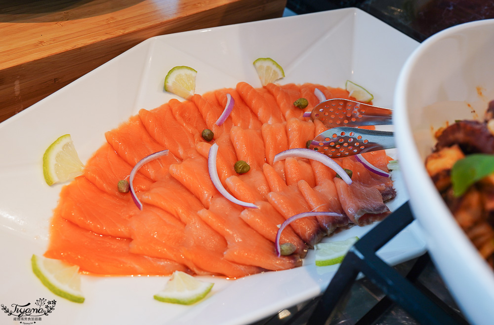 現煎鐵板料理台前 ,有一盤盤現煎鮭魚與戰斧小豬排,廚師是細心的衡量現場狀況現煎, 拿到的每一盤幾乎都是現煎不久,可自行加入紅酒牛排醬或蒜味牛油醬。