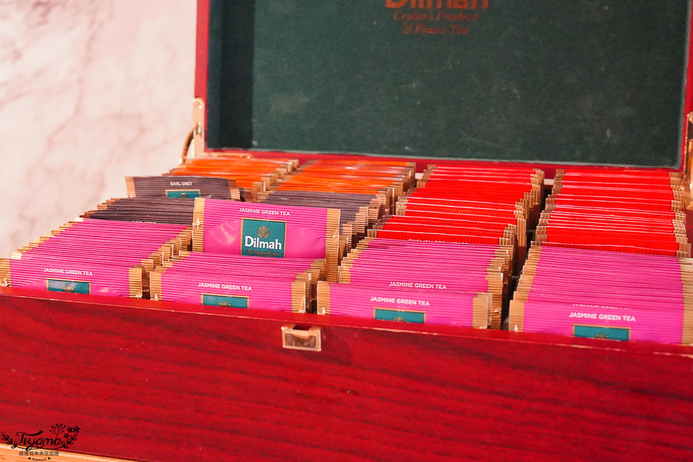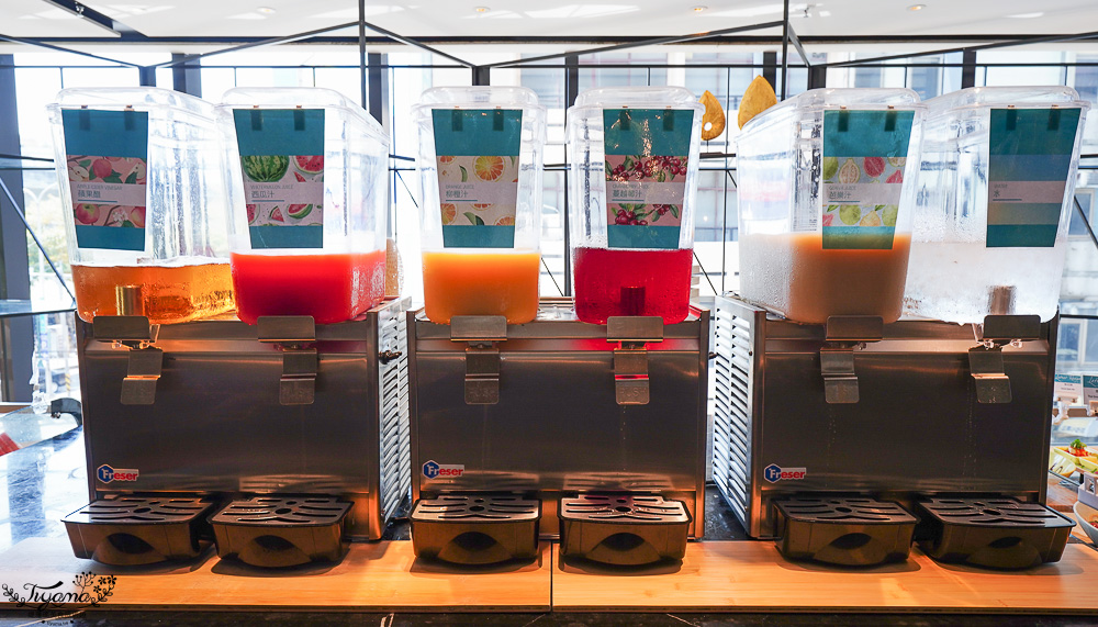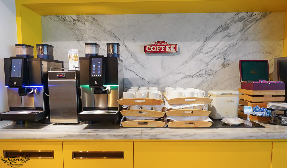 與果汁區放很近的還有咖啡機,義式咖啡能選擇的咖啡品項很多,想喝茶也有茶包可自助泡。