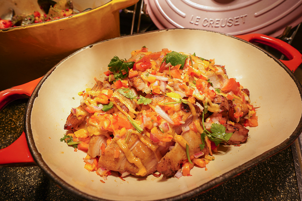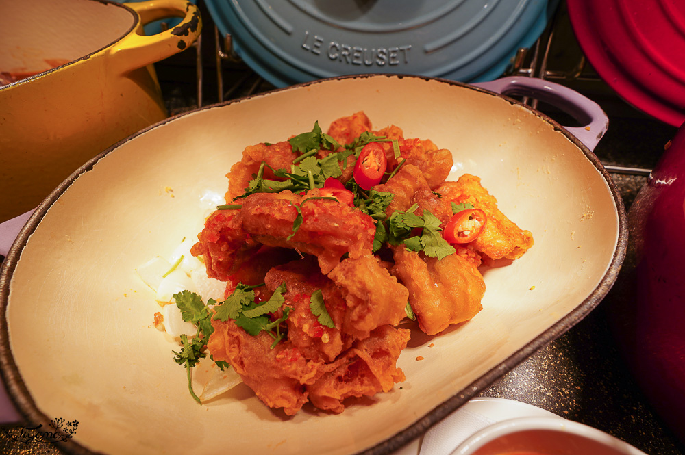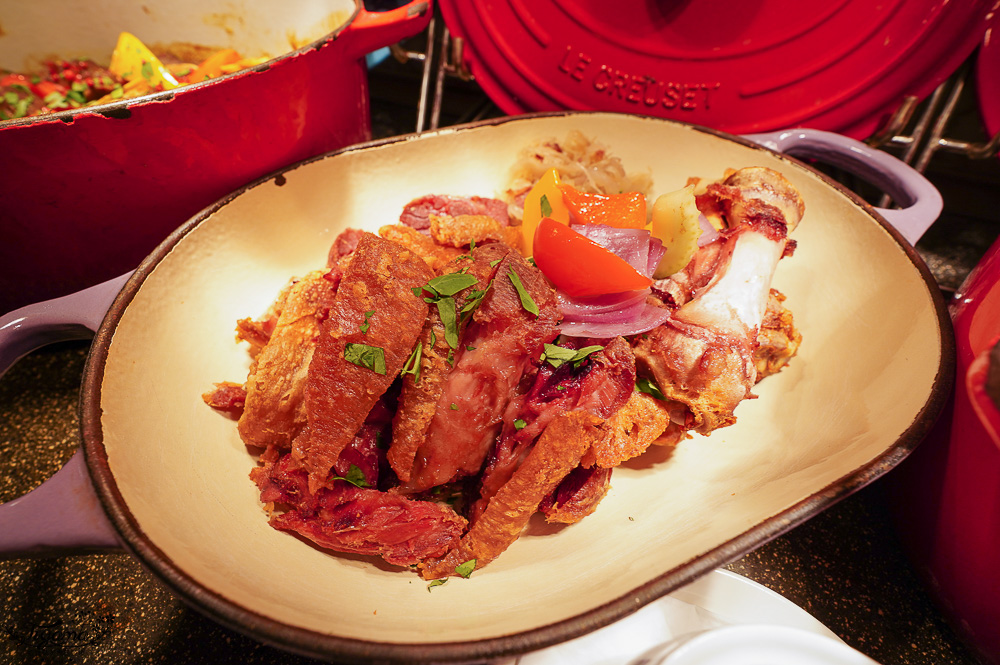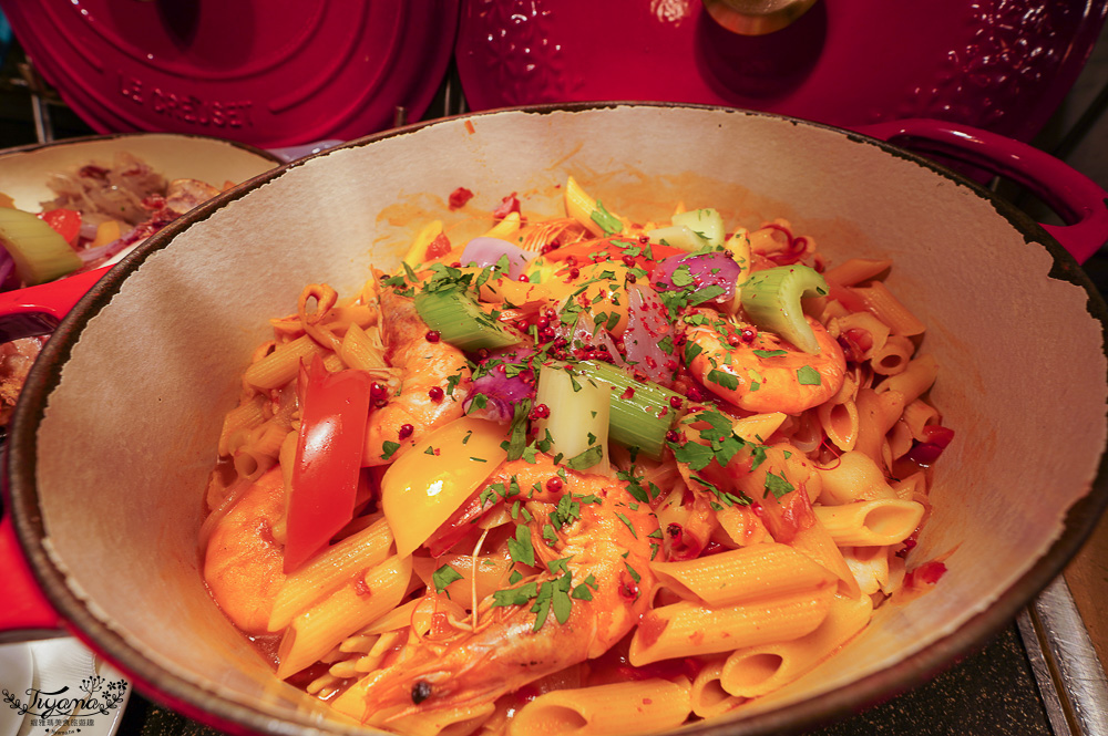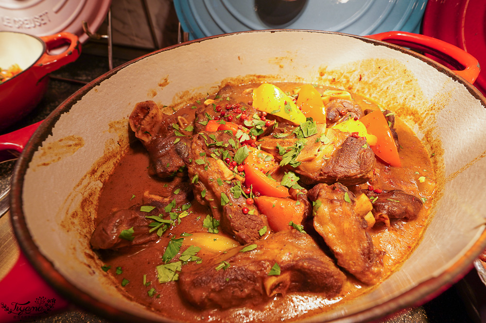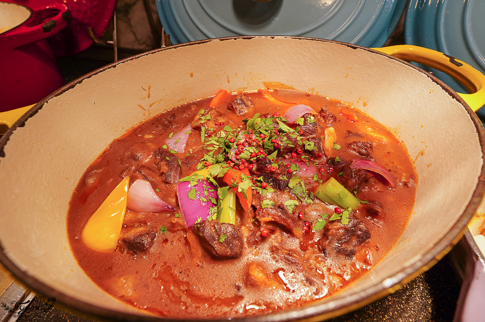 蛋酥滷白菜、酥炸鮭魚、匈牙利紅酒燉牛肉、蕃茄海鮮麵、德國豬腳。