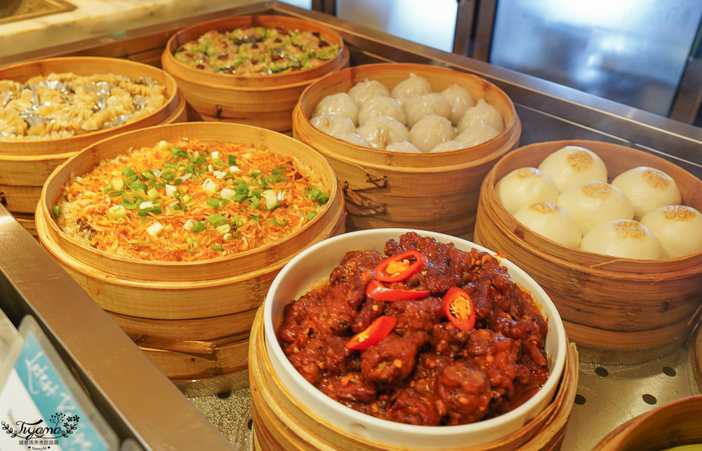 蒸籠港點區很精彩,有清蒸綜合蔬菜、蠔油鳳爪、奶皇包、肉圓、魚翅餃、香菇燒賣、櫻花蝦米糕,看了超有食慾。