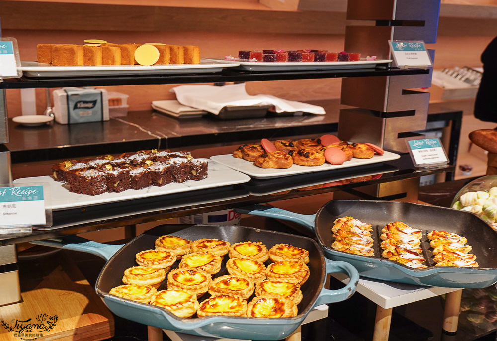 當日主廚精緻甜點,嚴選A.O.P頂級發酵奶油、大溪地香草莢、Valrhona巧克力,鳳梨酥與葡式蛋塔最受我的喜愛,其他還有…法式水果軟糖、布朗尼、蘋果派。