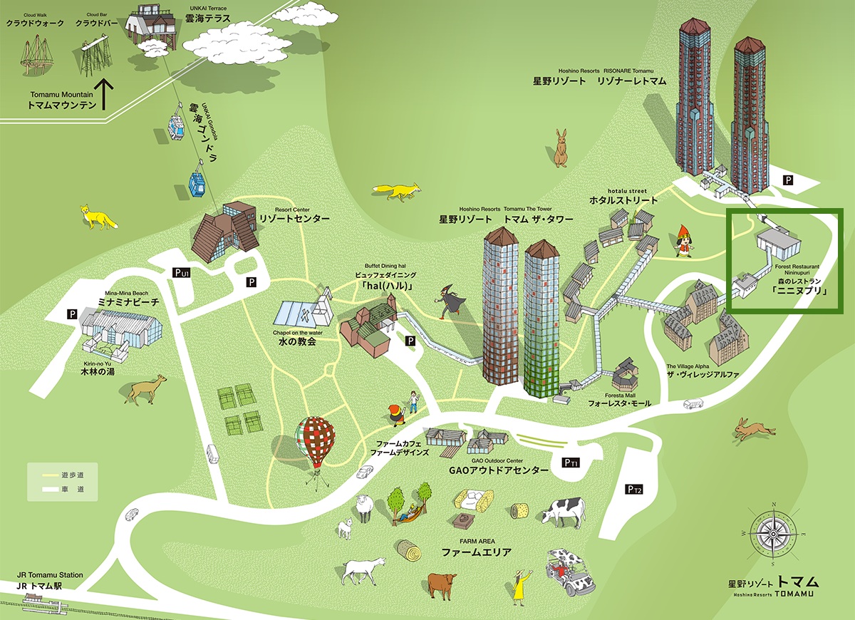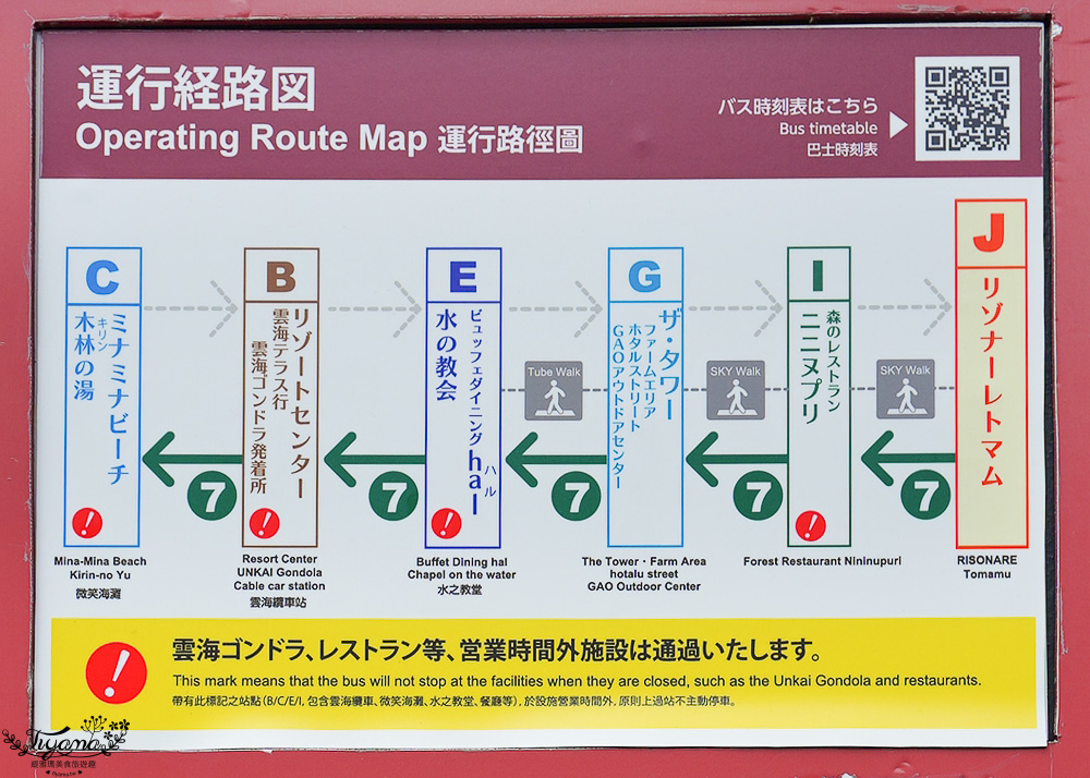星野TOMAMU度假村免費循環巴士,平均10~15分鐘會有一班車,森林餐廳 Nininupu  I  站點,往上坡的室內玻璃步道走即可到達餐廳。