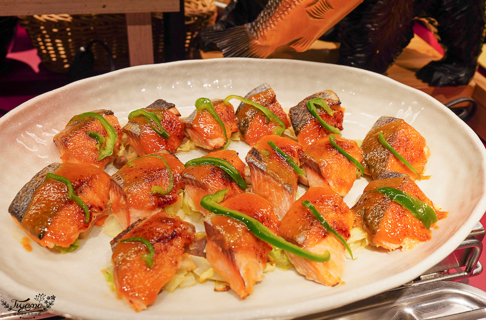 通常大家第一個會先衝生魚片餐台,今日有塊狀的鮭魚生魚片與鮪魚生魚片,別問我…為何是塊狀,我想是特色吧!而且這樣大塊的生魚片視覺感更霸氣,為了維持章魚口感,章魚片還是呈現常見的片片切法。
