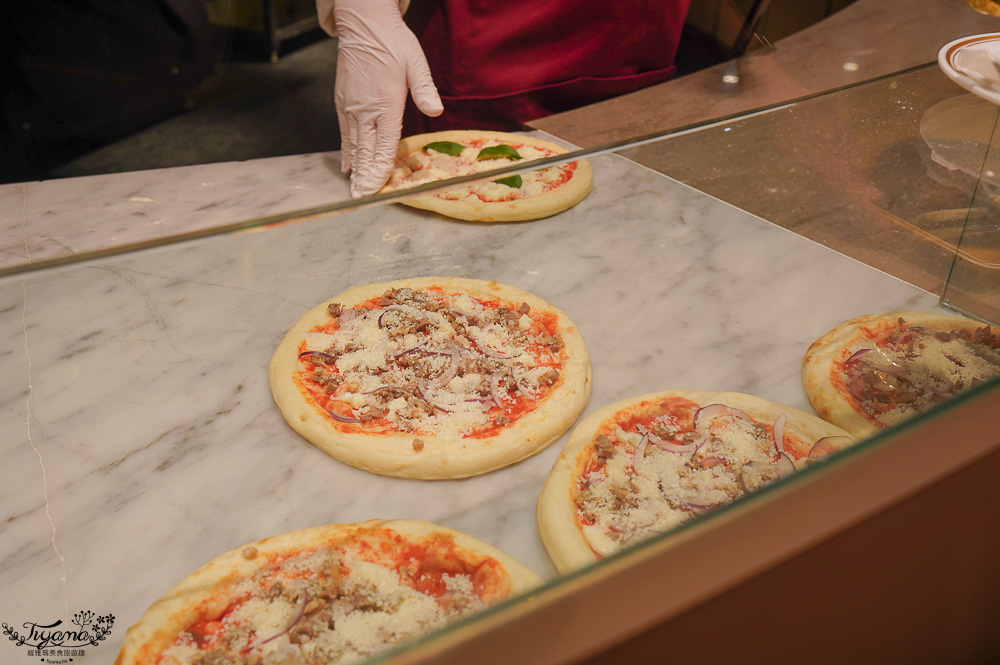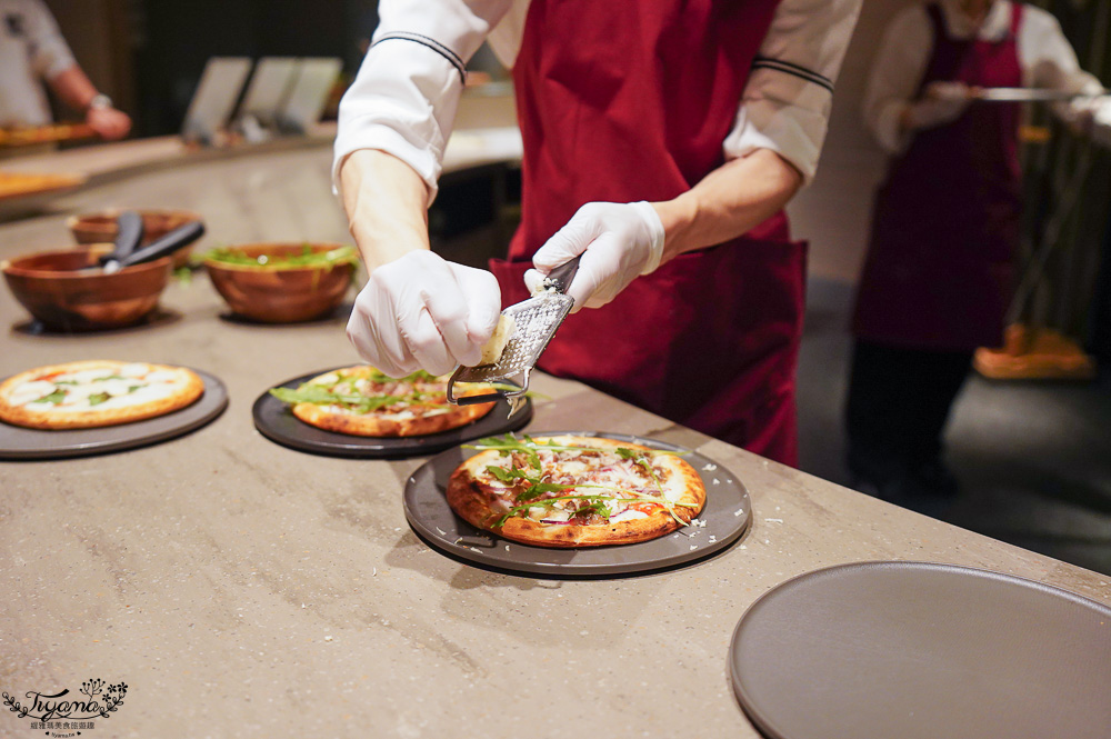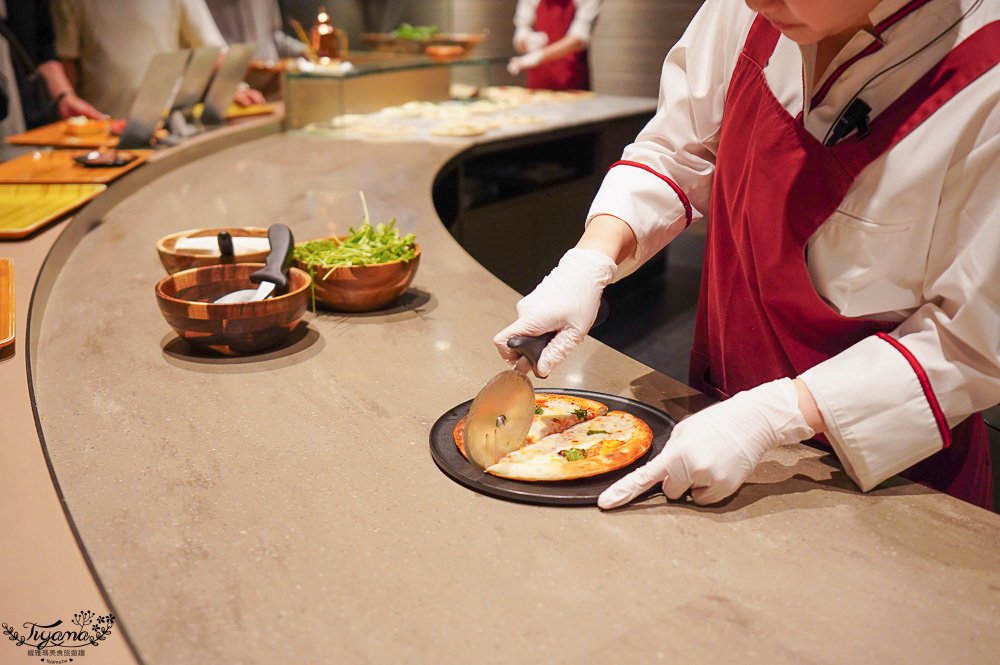 確認後再送上你的餐盤,速度其實很快,在旁等待也同等再看比薩料理秀,精彩萬分。