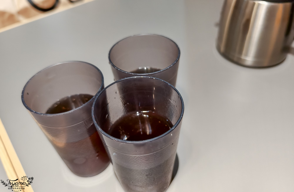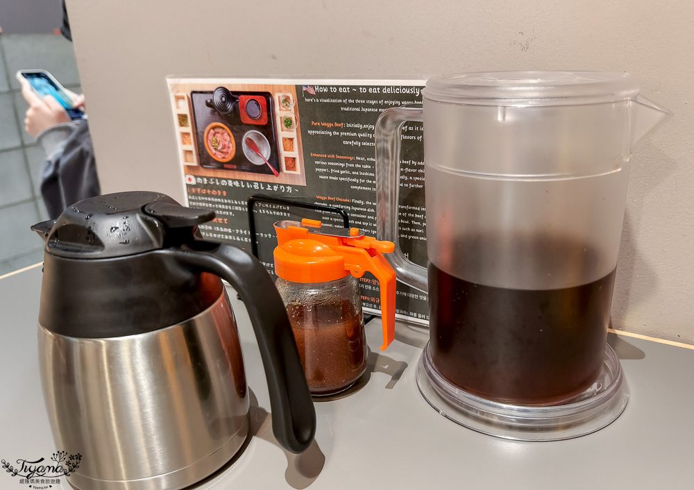每桌皆有一壺冰茶、熱高湯、特製沾醬,入座後會送上空杯供我們自行倒飲。