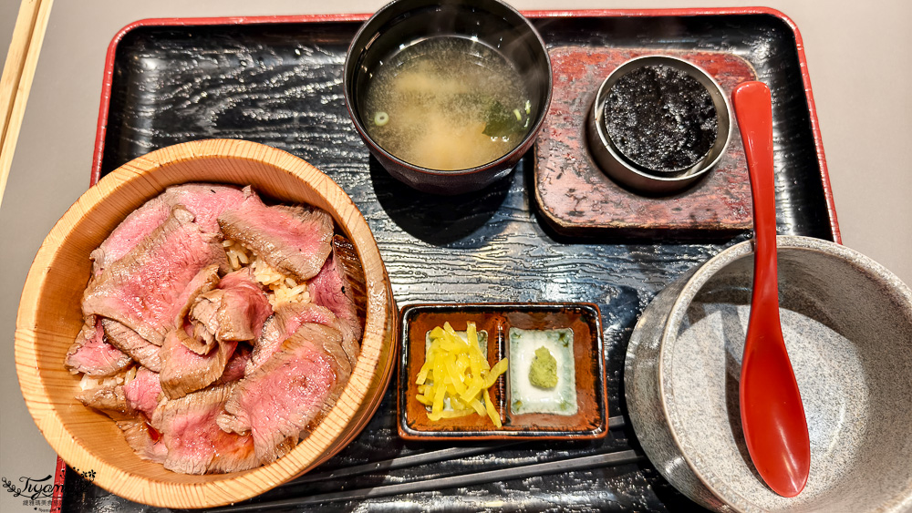 整套黑毛和牛丼飯皆是套餐,附上另外2種佐料(漬蘿蔔、山葵)、小圓烤板、味噌湯、碗,和牛赤身是瘦肉部份,正合緹緹(女兒)的味口,太油的肉她不敢吃。