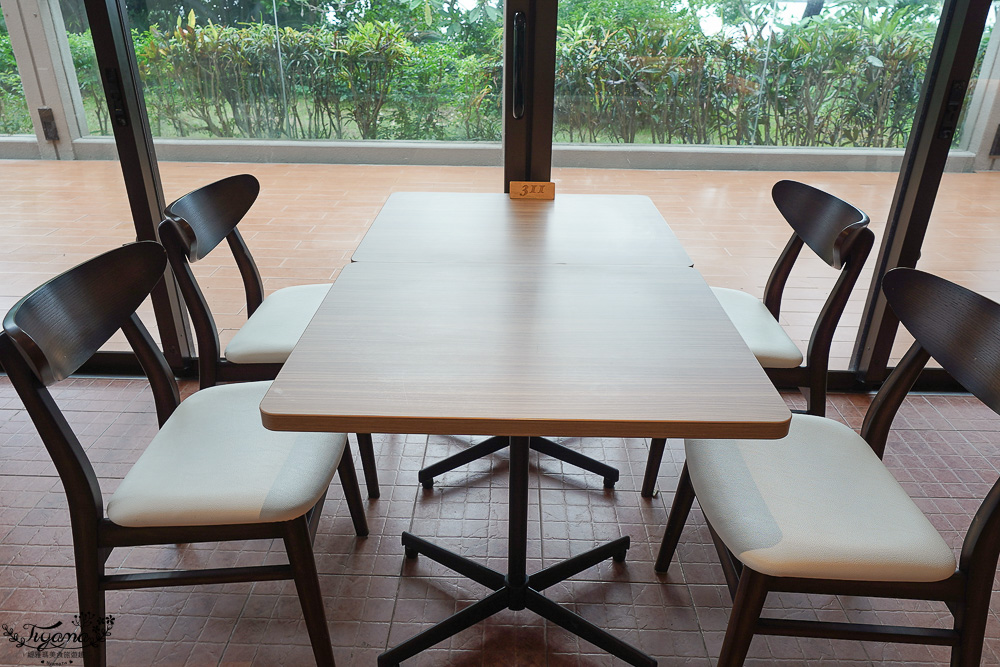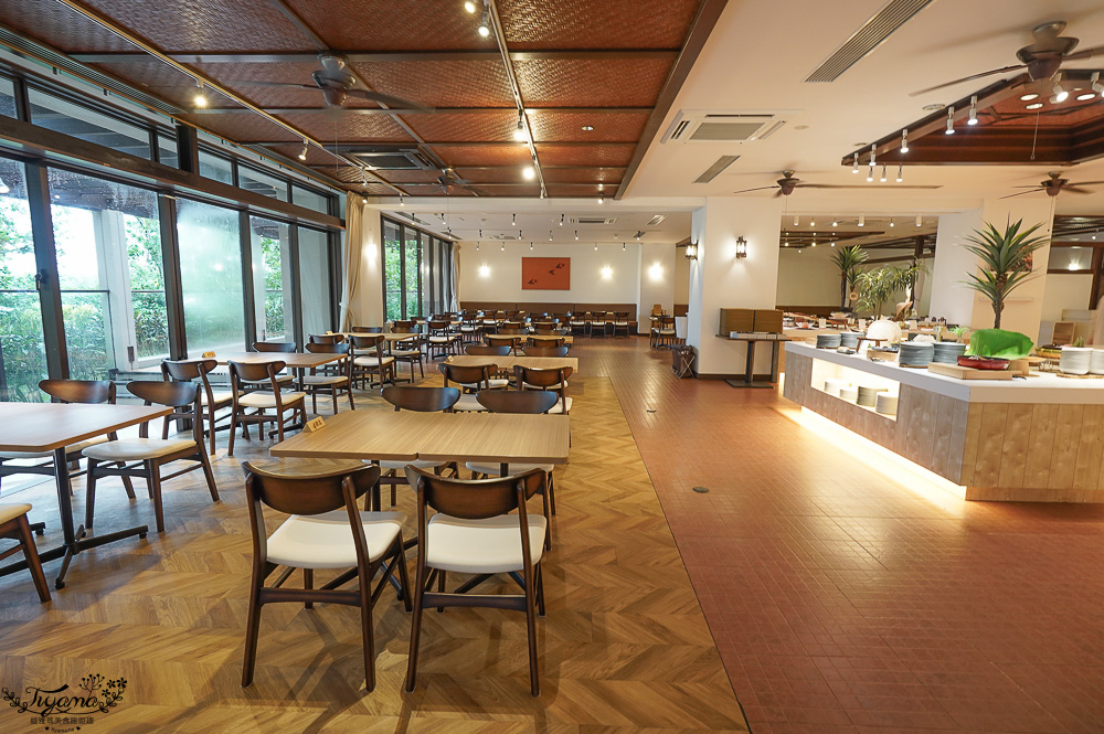 餐廳是熱帶南洋風格,兩面大片玻璃窗有綠意樹林與水藍清澈的泳池,坐在餐廳用餐也能感受到舒適的渡假感。