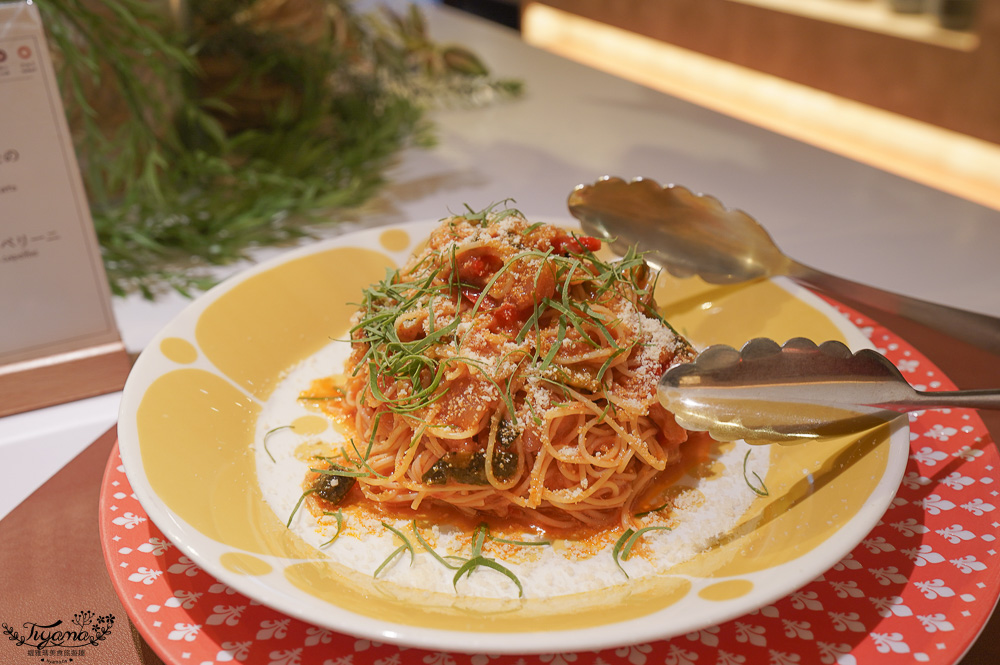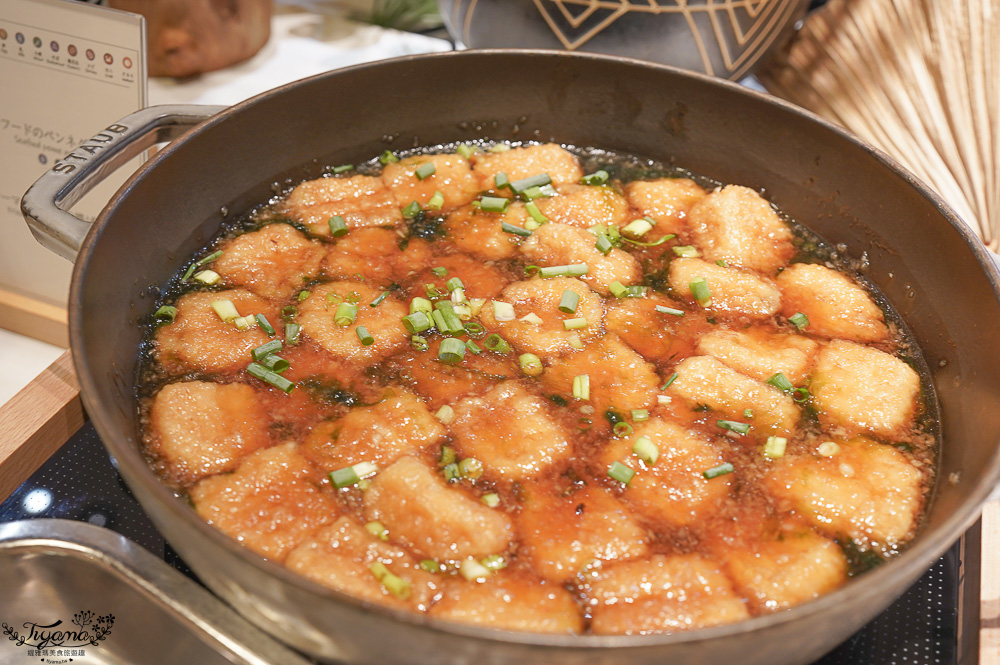自助餐台新菜色也更新了好幾道,讓人驚喜的秋葵義大利麵,舖上海葡萄更引人食慾,還有一道特製醬汁炸魚。