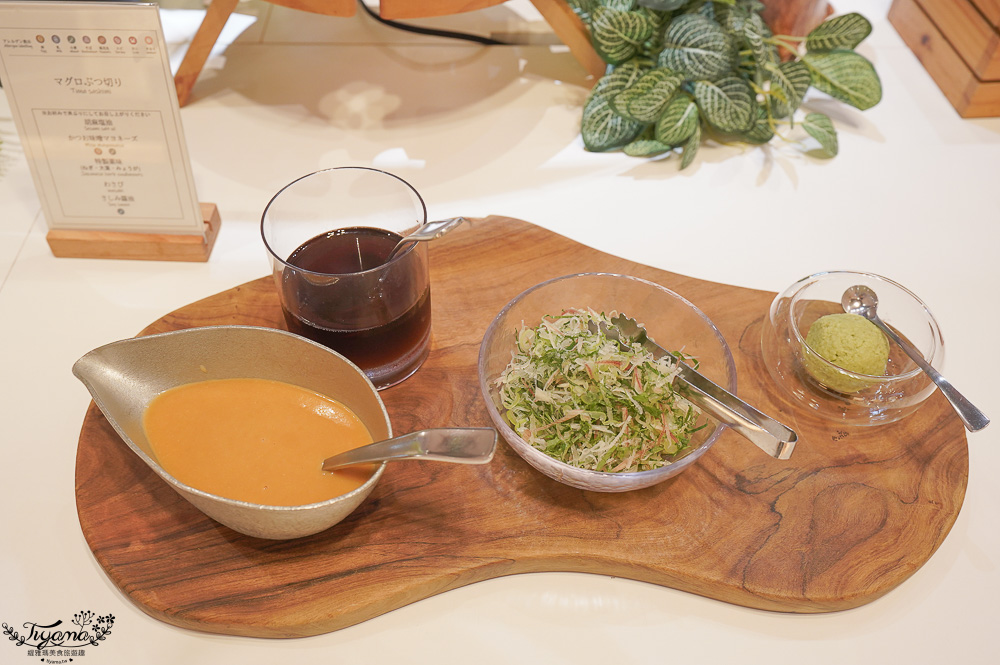 鮮美的鮪魚生魚片,特別的是除了醬油、山葵外,還有特製醬料,另外的洋蔥大蔥絲更是特別。