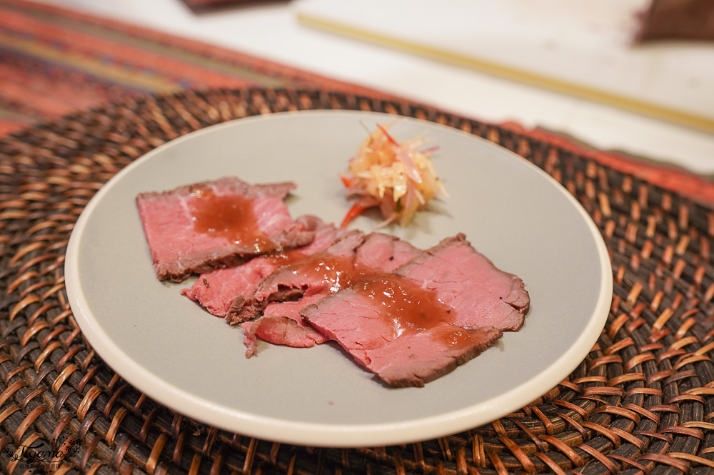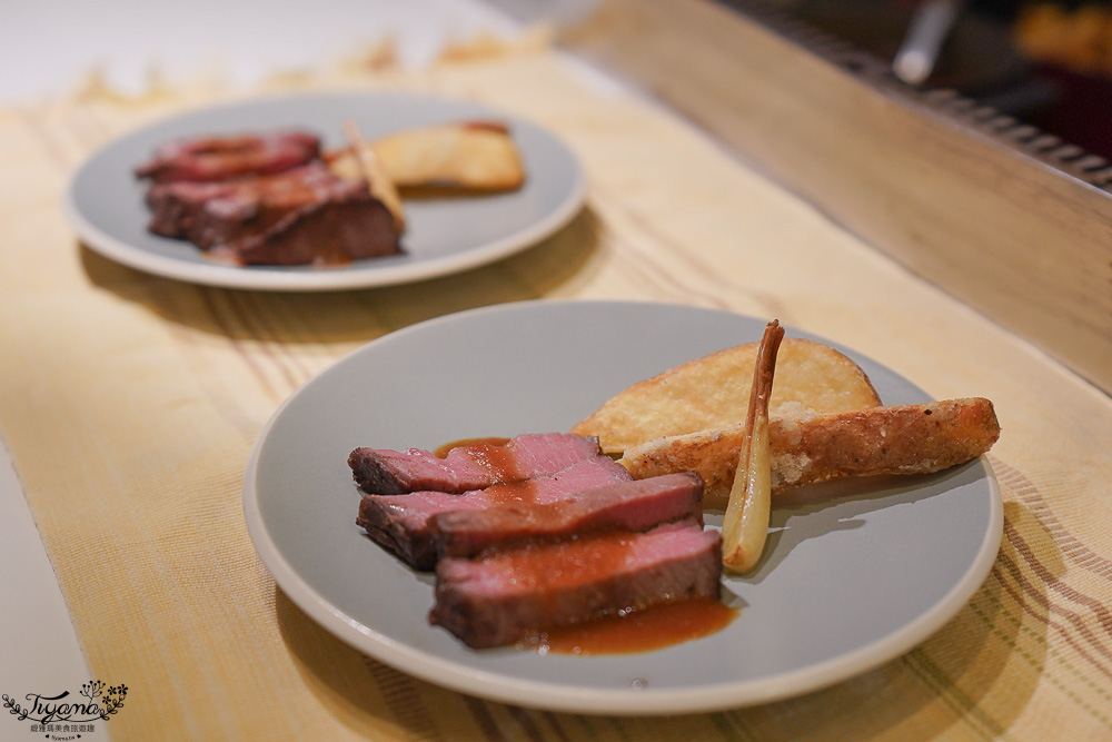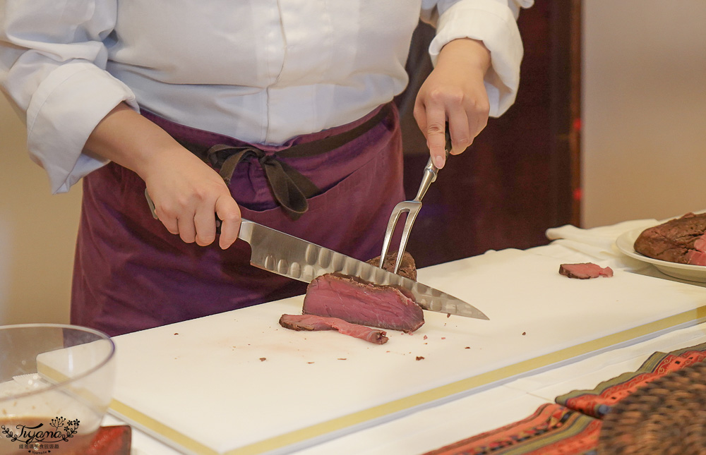 自助晚餐以亞洲菜為主,除了自助餐台料理外,還有廚師現場服務的料理餐台,現切沖繩牛排,廚師一刀刀現切再淋上特製醬料。