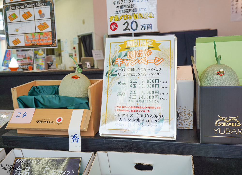 還有時間我們先在賣場逛逛,新鮮夕張哈蜜瓜依照品質分類,價格高低不同,也能現場買好到郵寄櫃台寄給親朋好友或寄回家。