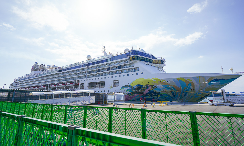 熊本停靠在熊本熊港八代,麗星郵輪的熊本岸上光觀一日遊不等人!!就算看到可愛的熊本熊部長也不能過去,回程再來草皮拍熊本熊大公仔!!