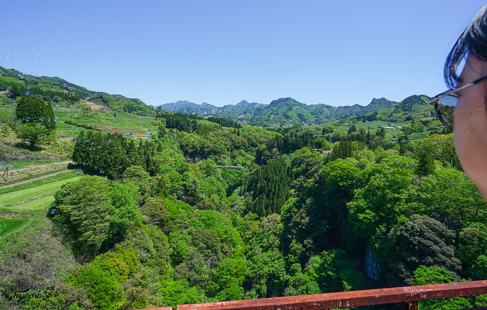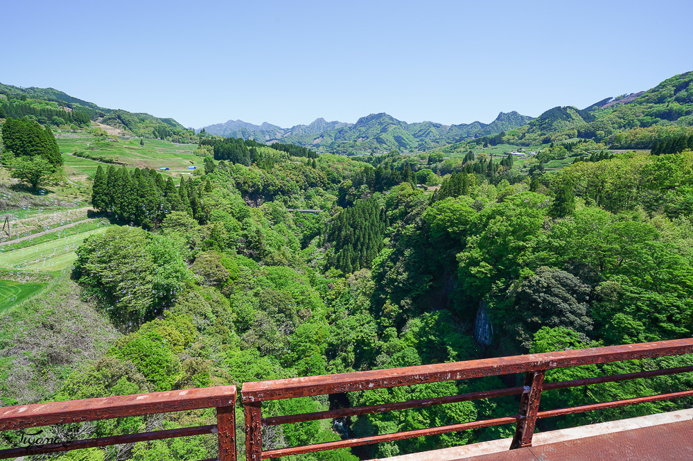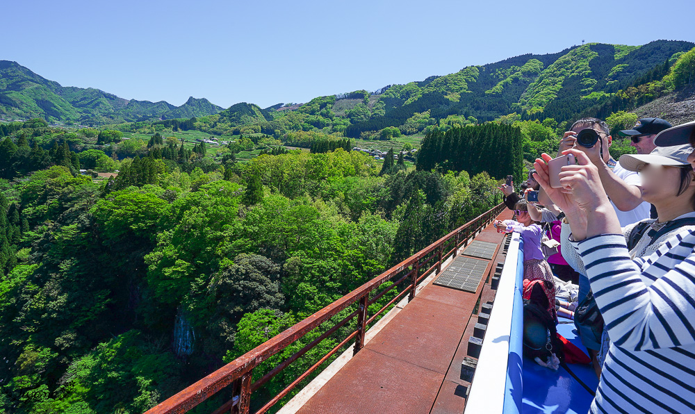 解說完再慢速行駛至日本最高的鐵路橋「高千穗鐵橋」,足足有105公尺高,往下望有森橡、河川、瀑布。