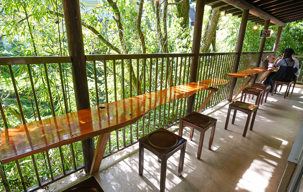 意外驚喜的是…往外走有很美的露台座位區,前方的大樹與竹木遮住陽光的光影把氣氛營造的很棒,認真往下望有看見峽谷正在划船的遊客們。