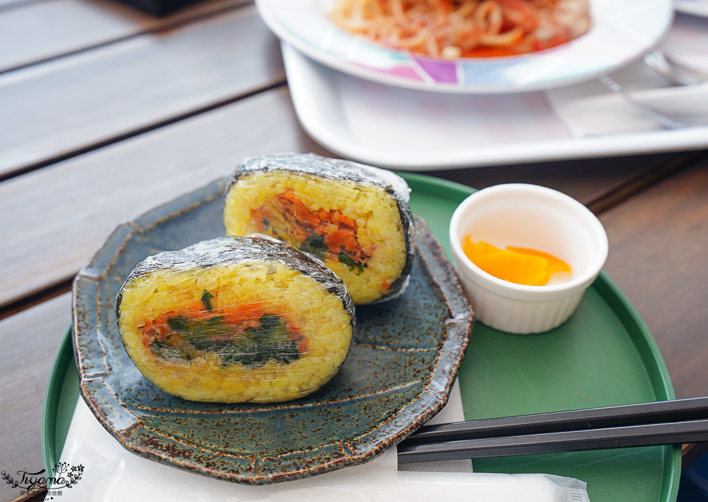 菜單的品項不多,主食有海老蕃茄義大利麵、海帶烏龍麵、金印飯糰,有優惠的加價飲料組合。