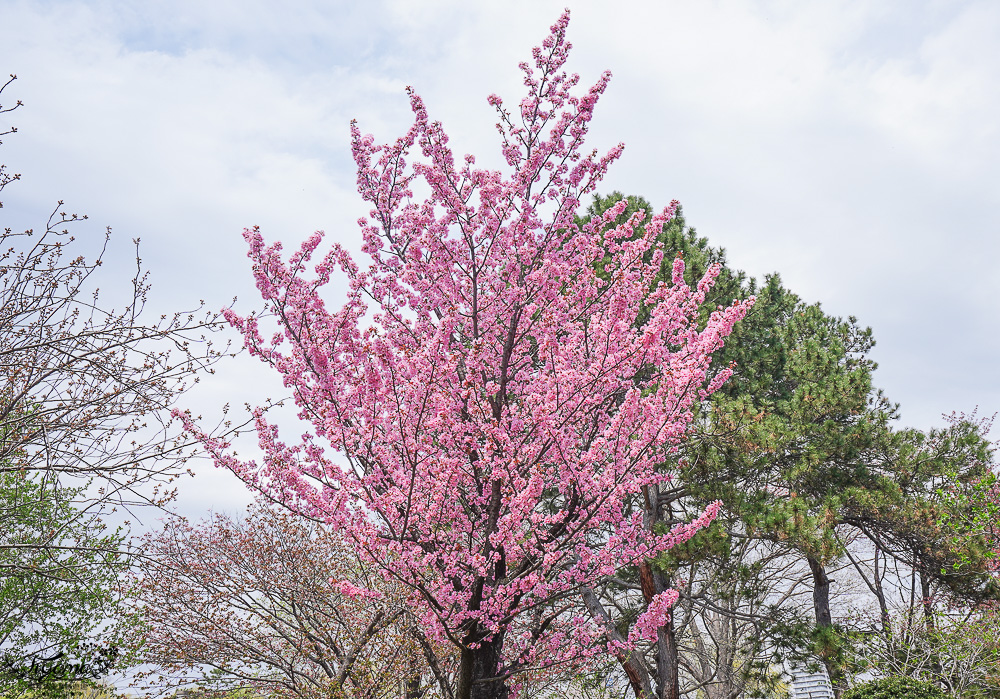 不遠處同樣盛開的桃紅色櫻花,也在萬綠萬粉之中,格外搶眼。