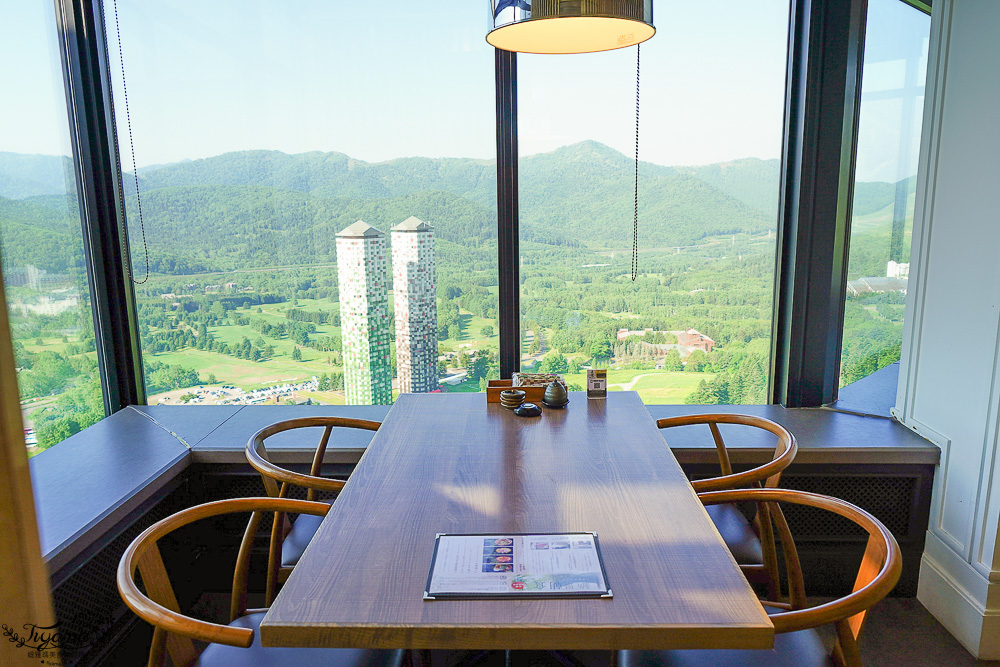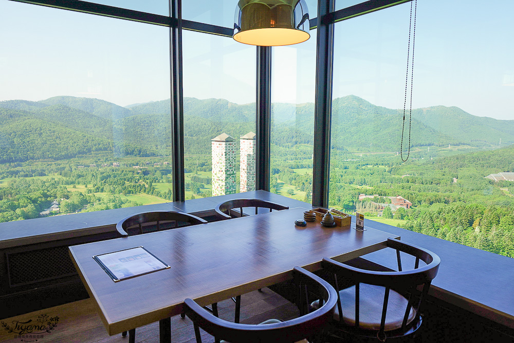 靠窗的包廂座位能見到整面以Tomamu The Tower by Hoshino Resorts為主的度假村景色,夏天一片綠意美景,翠綠迷人。