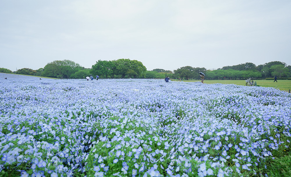 許多遊客忙錄著穿梭在粉藍花海,希望能拍下美麗時刻,若是好天氣~一定更美。